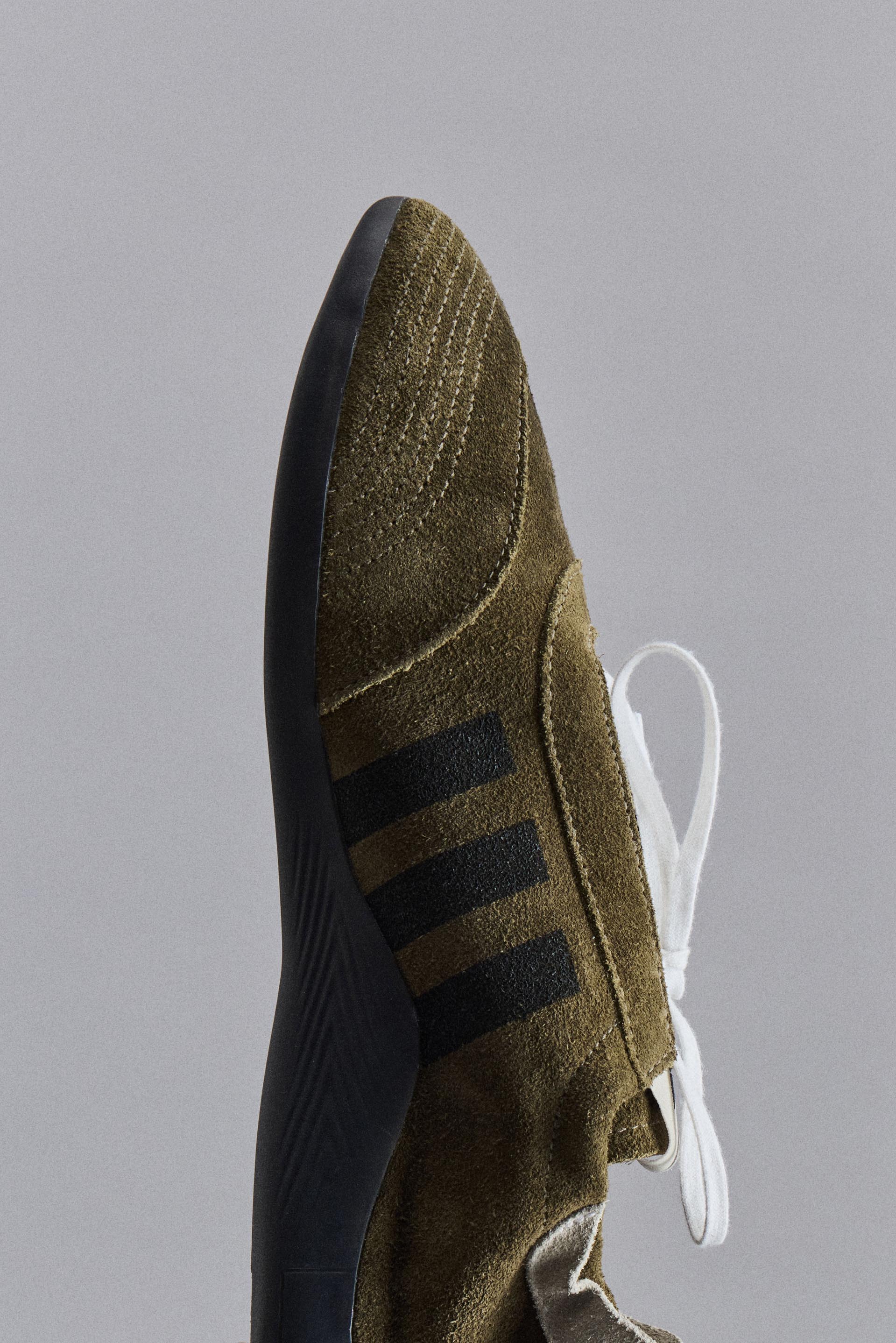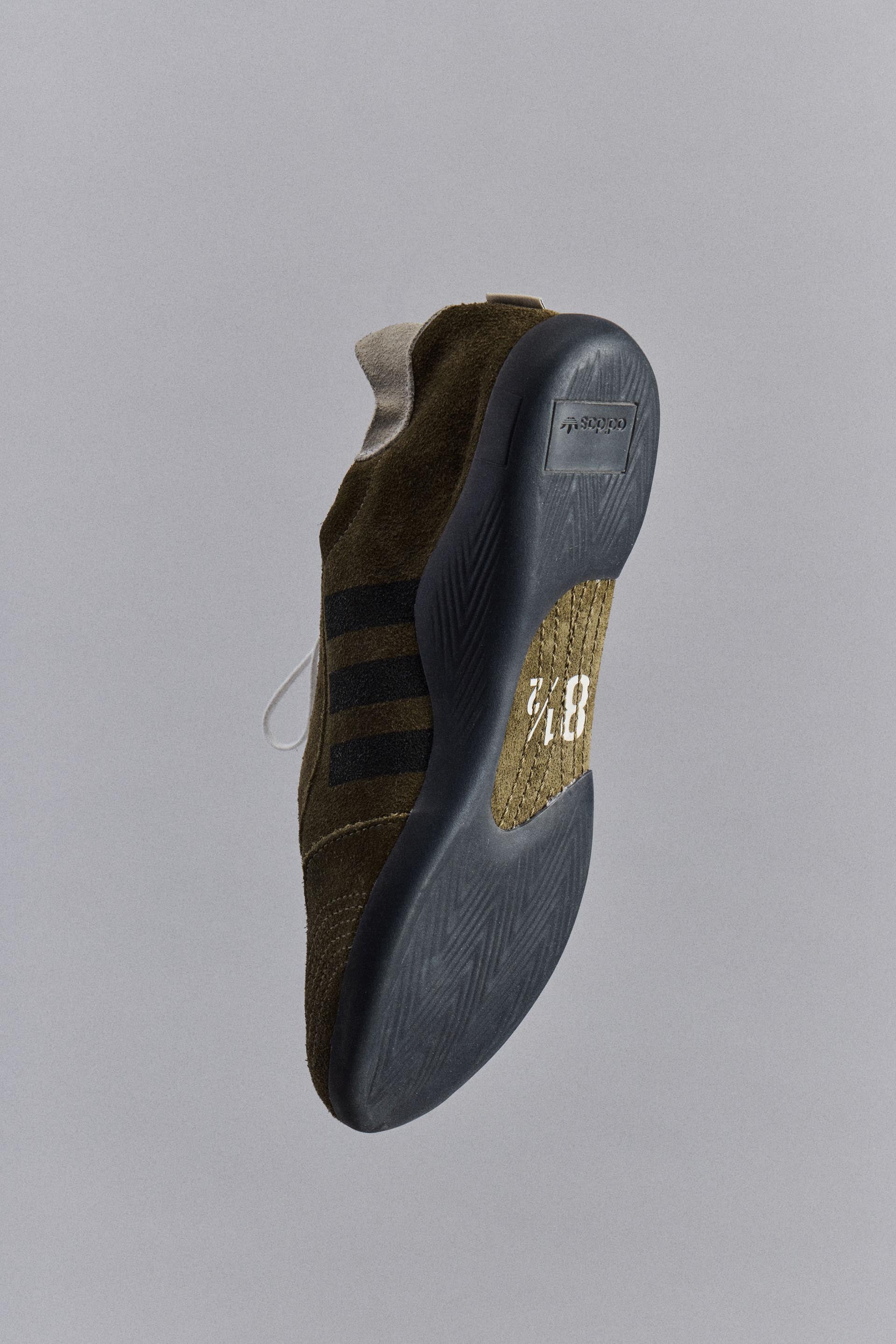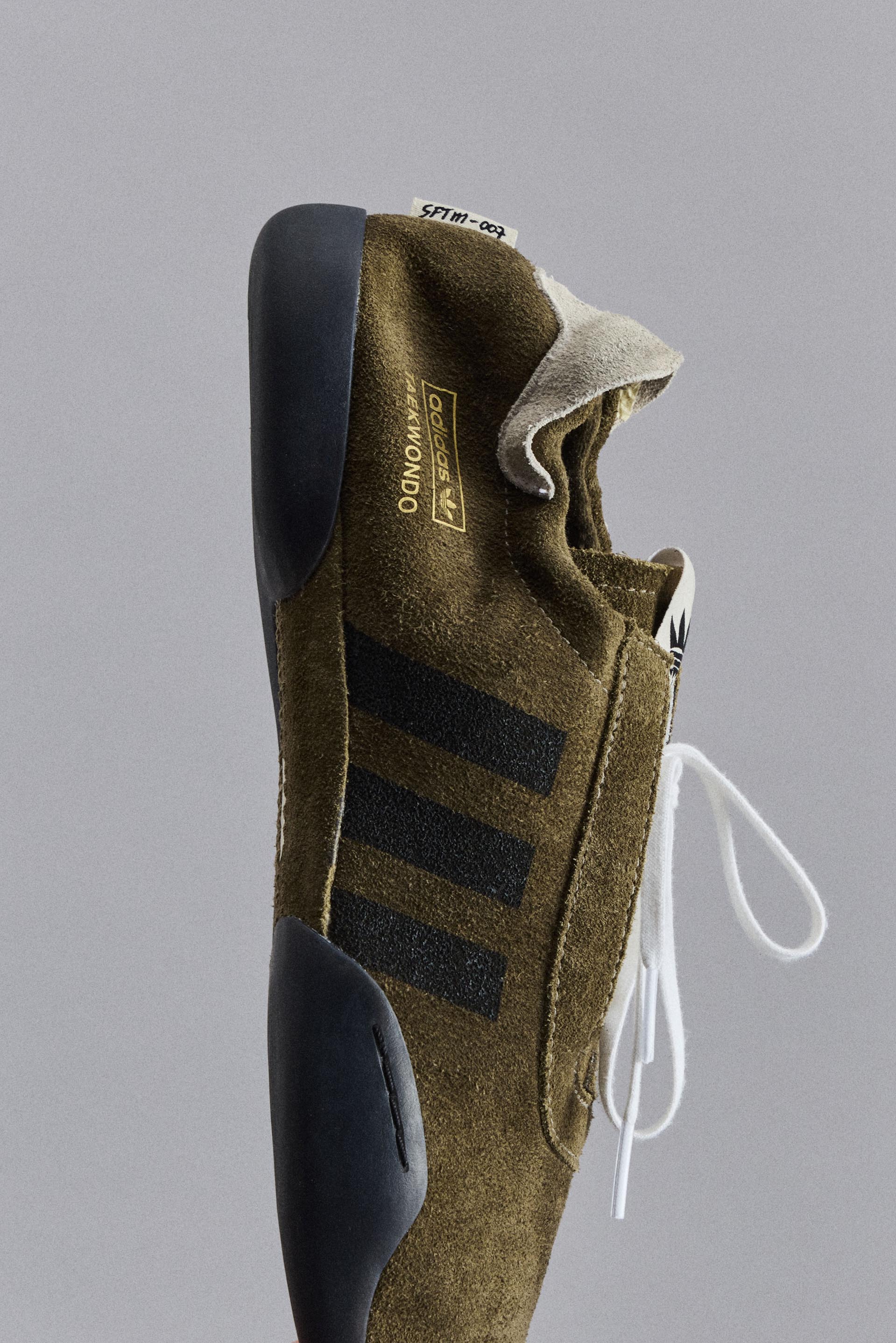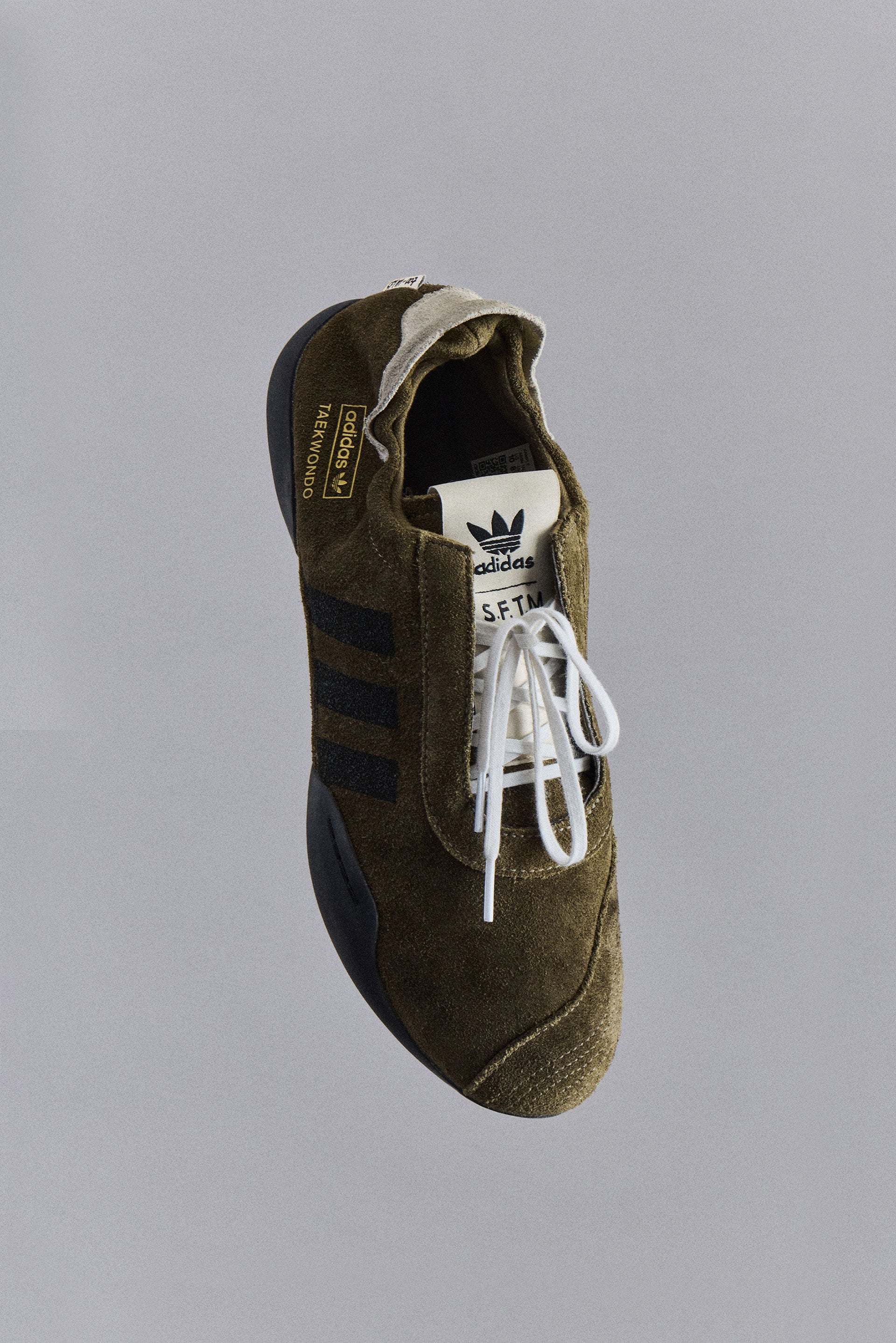 [SFTM-007] Taekwondo Mei reinterprets an archival adidas silhouette through the lens of Song for the Mute. Constructed in beige brushed suede, the upper carries a muted warmth, softened further by tonal stitching and raw-edged detailing.Contrasting black three-stripe marks anchor the side profile, with gold foil lettering and an exposed heel tab nodding to its origins. An elasticated heel lock secures the fit with ease, completed by co-branded tongue labels and a low-profile rubber sole.Each pair is individually distressed, ensuring no two are ever alike.Taekwondo Mei are in women’s sizing — we recommend going one size up for men’s sizing.